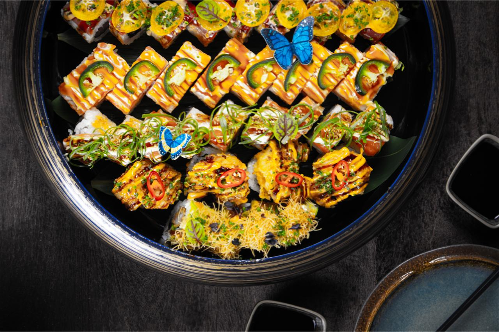Crab roll, Salmon, Tuna, Seabass topping, Wasabi mayonaise, Tobiko, Furikake